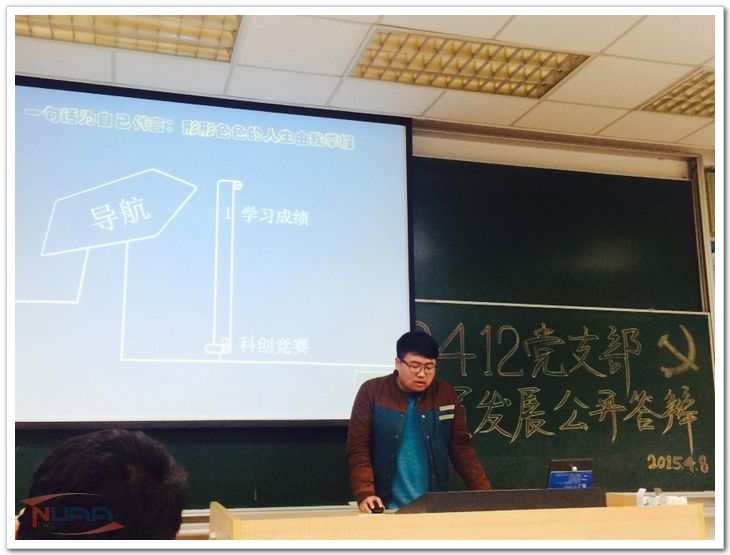 4月8日晚,0412党支部在将军路校区6号楼举行党员发展公开答辩,支部14名正式党员、18位入党积极分子以及30余位大众评审参与答辩会。 答辩共分为四个部分:“我为自己代言”,介绍自己的学习成绩、所获荣誉等基本情况;“我的故事”,讲述答辩人在志愿服务、学生工作、科技创新等方面具有代表性的故事;“我想对党说”,答辩人谈自己对党的认识理解及看法等:“别人眼中的我”,用一分钟的视频展示师生对答辩人的评价并作推荐。积极分子们个人展示内容丰富,层次清晰,言辞精炼,妙语连珠。在最后的提问环节,积极分子们的精彩回答不时博得在场老师同学们的阵阵喝彩。 据电子信息工程学院2012级辅导员介绍,答辩既实现了对学生面、点的考察,鼓励积极分子们实现共性发展和个性发展,而且从不同视角全方位地对积极分子进行评判,选出了师生心目中最优秀的学生。经投票表决,薄磊等15名同学通过了公开答辩,进入学院学生党总支预审环节。 ![]() |