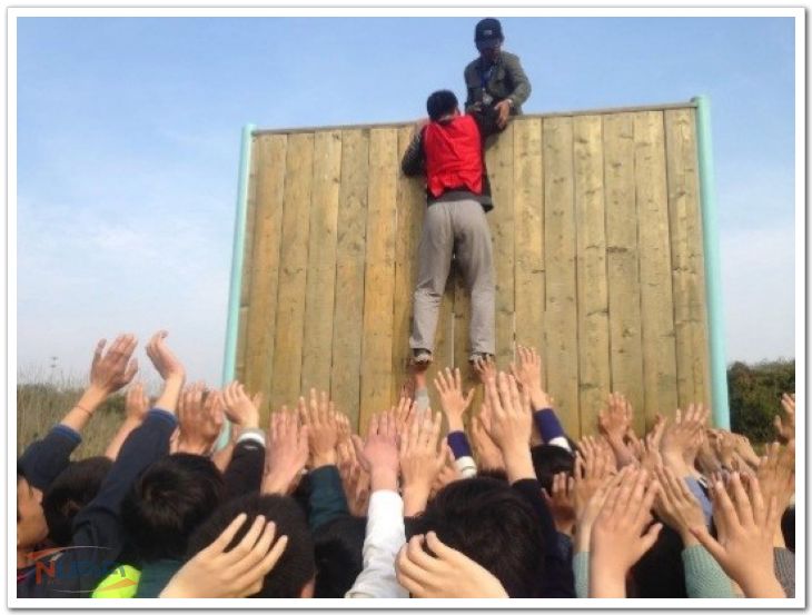 这不禁让人想起《泰坦尼克号》中的经典桥段:“Do you trust me?”“I trust you.” 是啊,笔直的向后倒下,是本能的突破,也是人性的释怀。彼此的信任来源与彼此的责任和关爱,团队的支持是个人敢于挑战的基础。 求生墙——完美的表现 随着各种活动的进行,素质拓展的高潮也到来了。在没有任何器械帮助的情况下,完全依靠人的力量翻越4.2米高的求生墙,这将是我们此次素拓的结业项目。开始大家都望“墙”兴叹,当被问及多久可以全部翻过时,两个小时成了最肯定的回答。在教练介绍完注意事项后,大家纷纷建言献策,最后敲定了“强-弱-强”的三步走方案。许林东、李想、姜伟在下面做基座,在他们的帮助下,张祎率先爬了上去。他身手敏捷,为全队树立了信心。随后,几位同样矫健的男生也爬了上去。接着,女生开始攀爬,下面的基座用肩扛,用手托,上面的同学用尽全力拉,其余同学围成一圈,双手举起,形成最坚实的保护。