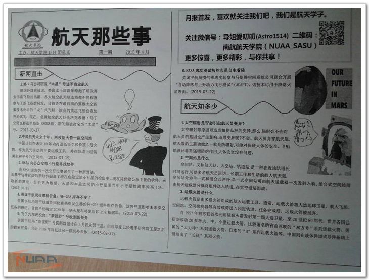 你是否近日在校园收到一张航天报纸?是否看到他人拿着一张A4大小的报纸在看?是否在辅导员的桌子上看到“航天那些事”那醒目的标题?没错,航天学院的《航天那些事》航天小报正式出版了。