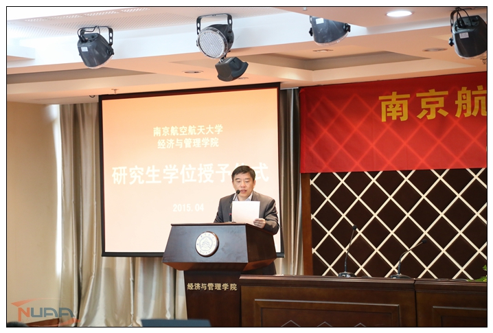 4月9日下午,经济与管理学院在将军路校区学院报告厅举行2015届研究生毕业典礼。学院领导、专业老师代表、2015届研究生和家长代表出席了典礼。