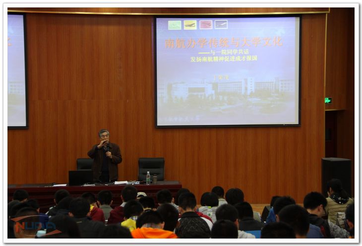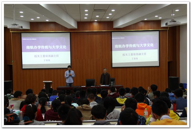 4月19日晚,在南航将军路校区2111教室,航空宇航学院13、14级数百名学生齐聚一堂,共同聆听由关工委常务副主任丁荣茂老师带来的“南航办学传统与大学文化”专题讲座,给参与的学生们上一节关于理想信仰的素质能力培养课。 “昨天为祖国解放而战斗,今天为祖国建设而学习”“艰辛成就伟业,奋斗创造辉煌”,讲座现场不断传来鼓掌声,丁老师用富足的文字材料、图片材料向在场学生娓娓道来南航的办学历史,让那一件件在校史馆中沉默的文物鲜活起来,诉说一件件那些文物背后的故事。同时丁老师还从南航的地理位置、校风、校歌、校训等来在场的每一位同学讲述南航背后从明故宫开始的历史积淀,用现今南航的杰出校友、丰硕的科研成果讲述现在的南航的活力。