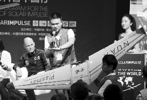 “We love Nanjing”“我在大家这个年纪,就有要去远方飞行的梦想,然后把它付诸行动,才有了今天的环球飞行”……在一阵热烈的掌声中,飞行员贝特朗·皮卡尔和安德烈·波许博格露面。尤其是刚从瑞士休养后来到南京的安德烈,看上去气色不错。 两位飞行员乐呵呵地接受了花环,并和孩子们一起唱起了《茉莉花》。不过,最让两位飞行员好奇的,是来自南京航空航天大学学生刘舒霆的航模。在重庆的时候,安德烈就表现出了对航模的兴趣,他曾经问记者:“哪里有比较好的航模店?”刘舒霆带来了三架航模,分别是:X飞行器、变形金刚模块型飞行器、紫电无人机。X飞行器横截面造型就像“X”,体重只有200克,能快速垂直起降、空中悬停,现在已经完成了多项侦查任务;而变形金刚模块型飞行器也很厉害,速度可以和“阳光动力2号”相媲美。 “紫电”最牛,在2013年第二届“中航工业杯”国际无人飞行器大奖赛上获得唯一一个特等奖。“‘紫电’在黑暗中会发出蓝紫色的光,机翼上布置了可以发出紫色电晕的等离子体激励器,可以让飞机飞得更远更高。如果‘阳光动力2号’安装我们的等离子体激励器,可以让飞机变得更轻便,飞得更高、更远。”刘舒霆说。刘舒霆说完,两位飞行员从座位上站了起来,他们拉着刘舒霆的手,充满了好奇。“你能不能表演一下给我们看看?”还各自给刘舒霆一个温暖的拥抱。遗憾的是,由于场地问题,刘舒霆的模拟飞行器现场没有飞起来,不过,他说如果有机会会表演给两位飞行员看看的。