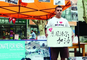 尼泊尔发生的大地震,牵动着尼泊尔在中国求学的学子的心,近两天,南京航空航天大学的尼泊尔留学生们自发组织了起来,互帮互助。昨天,现代快报记者来到南航校园,了解到在此次地震中,绝大部分尼泊尔留学生的家都受到了不同程度的损毁,其中一名大四年级同学的父亲,还在地震中不幸丧生,这位学生已启程回国。 留在南京的留学生们想到用募捐的方式支援祖国。记者在募捐活动的现场看到,挂着“尼泊尔加油”等鼓励和祈福的标语,组织者们还特意穿起了印有“我爱尼泊尔”字样的T恤,仅半天时间就募集到几千元爱心款。“