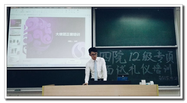 4月28日晚19点,为了让同学们在求职面试中给面试官留下良好的第一印象,赢在就业的起跑线上,电子信息工程学院12级就业部专项组在6203教室举办“四院12级专项面试礼仪培训”活动。 此次活动,校大使团副团长、讲解队队长俞舟和礼仪队队长万水千山详细讲解了面试的礼仪,为即将就业的同学提供了巨大的帮助。培训中,俞舟同学详细介绍了面试过程中服装穿着技巧,包括衣服和鞋子的款式、搭配、颜色,到领带的纹饰和打法, 丝袜的材质和颜色,细致入微。万水千山同学则针对形体礼仪向同学们做了详细的讲解。两位大使身体力行,用自身的行动表率和生动的肢体语言向参加培训的同学展示了得体的穿着搭配和正确的站姿、坐姿,走姿。