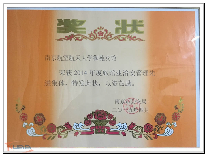 4月29日,在华世博纪大酒店召开的南京市秦淮区旅馆业表彰大会上,南京航空航天大学御苑宾馆荣获南京市“2014年度治安管理先进集体”荣誉称号。 2014年,御苑宾馆在后勤集团和接待服务中心的领导下,宾馆时刻将治安管制工作作为重中之重,责任明确到岗到人,全年未发生一起治安事件、住客登记无差错,并圆满完成了“青奥会”官方媒体重大接待任务,治安管理水平再上新台阶。