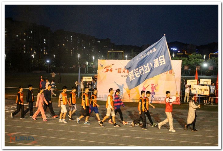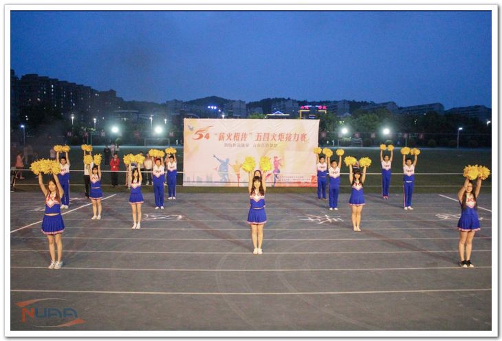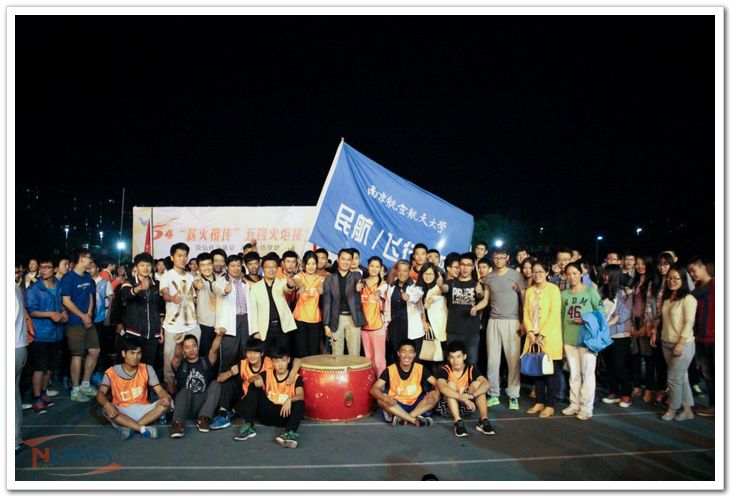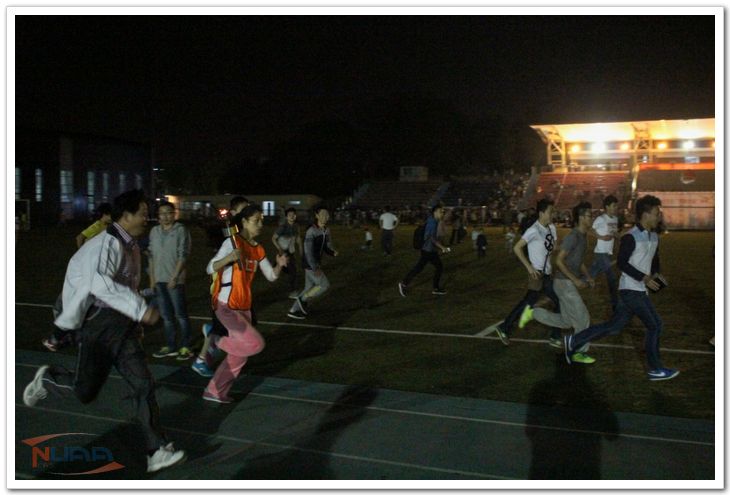 2015年5月4日晚7点,南京航空航天大学第十四届“薪火相传”五四火炬接力赛在将军路校区西操场拉开帷幕,校方各部门领导、老师以及各学院学生前来观赛。民航/飞行学院党委书记倪晓众、院党委副书记宋凯、院团委书记傅成成以及各辅导员老师也前来观看比赛,为运动员们加油助威。由各学院组成的十六只队伍历经一小时的激烈角逐后,民航/飞行学院再次斩获第一,实现此项赛事的六连冠! 接力赛还未正式开始,先前在校啦啦操大赛中获得第一名的民航/飞行学院啦啦操队伍便为大家带来了一场热情洋溢的啦啦操表演,为大赛现场注入活力。而当观众们还未从这场视觉盛宴中回过神来时,十佳歌手余紫璇带来的本次大赛主题曲《逆光》,又带领现场进入新一轮的听觉盛宴。精彩绝伦的表演后,随着运动员庄严而郑重的宣誓的结束,国旗护卫班和优秀学生代表护送国旗和火炬缓缓入场。火种传递给各学院领导,再由各学院领跑火炬手从中接过火炬,由此比赛正式开始。每支接力队伍由十男两女组成,分别绕指定路线及操场跑道完成接力。而运动员在奔跑的同时,西操场的观众们也在为接力的选手呐喊助威。尤其引人关注的是七院女飞行员的出场。即使是女生,她们也拼尽全力向前奔跑,现场气氛一度被推上高潮,加油呐喊声响彻整个操场。伴随着不绝于耳的“七院,加油!”“七院,必胜”!等口号,民航/飞行学院的运动员们凭着坚韧的毅力一路领先,最终不负众望以绝对优势蝉联冠军宝座。