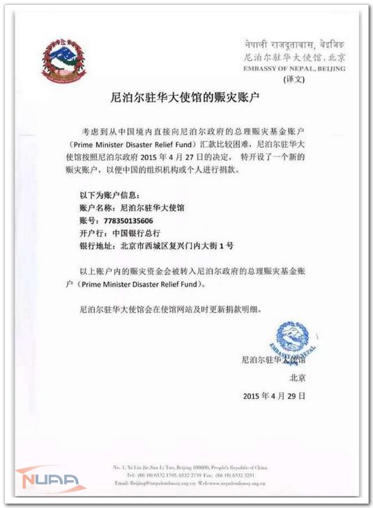 4月25日,尼泊尔发生里氏8.1级强烈地震,发生的大地震毁掉了尼泊尔19万栋房屋,造成7500多人死亡。尼泊尔城市、乡镇、学校、住房以及社区损失超过50亿美元(约合人民币310亿元),现在有810万尼泊尔人需要援助,其中300万人需要食物援助。 我校的三十多名尼泊尔留学生在得知这一消息后,心系祖国的安危,自4月27日起自发组织“为尼泊尔祈祷”募捐、祈福活动,在明故宫和将军路两个校区同时通过展板和文字的形式向师生宣传尼泊尔震后情况,开展募捐;来自印度、肯尼亚、孟加拉国等20 多个国家的留学生与我校校研究生会、学生会和留学生会的同学也纷纷加入募捐行列,帮助尼泊尔兄弟姐妹们共渡难关,为尼泊尔重建美好家园献出自己的一份爱心。 此次募捐活动得到我校广大师生的积极响应和大力支持,截止5月5日,通过各种渠道共筹集善款共计人民币68505.92元。5月6日上午十点,我校七名学生代表在江宁中国银行将募捐款汇入尼泊尔驻华大使馆赈灾账户。感谢所有的帮助者,心系尼泊尔,为尼泊尔祈福。有限的捐款代表的是无限的爱心,相信我们的爱会早日流入尼泊尔,让尼泊尔的兄弟姐妹感受到来自中华儿女的爱与帮助,坚定信念,战胜困难,重建家园。 ![]() ![]() ![]() |