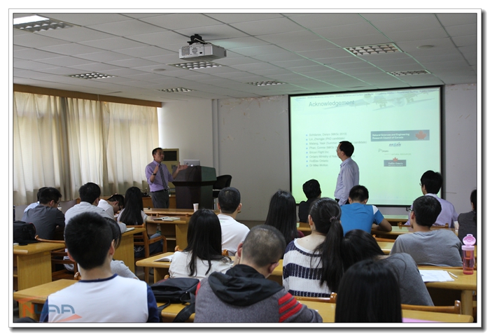 5月12日,应自动化学院邀请,加拿大多伦多大学(University of Toronto)的刘泓涛教授访问了自动化学院自动控制系。 下午,刘泓涛教授在智能楼四楼的学术报告厅作了题为“Wildfire Monitoring Using UAVs”的学术报告。报告会由自动化学院院长姜斌教授主持,自控系部分师生参加了报告会。刘泓涛教授首先很愉快地向我们介绍了多伦多大学以及其所在航空航天研究所(UTIAS)的基本情况,包括地理位置、创办历史、生源师资、教育科研等。然后,围绕报告主题,刘教授从研究背景出发,阐述了无人机系统应用于森林防火的现实需求和独特优势,而后从火情发现和火情估计两方面详细介绍了系统模型的建立和已有研究成果的野外验证。最后,刘教授认真地解答了每位师生提出的疑问,并对课题研究前景与挑战作了展望。整场报告会从工程应用的角度极大地拓宽了我们的视野,活跃了我院的学术氛围。报告会历时一个半小时,在热烈的掌声中圆满结束。 刘泓涛教授简介: 刘泓涛教授于1998年获加拿大多伦多大学博士学位,现任职于多伦多大学航空航天研究所,分管研究生工作,并主持“飞行系统与控制”(FSC)实验室。他在自主无人系统开发、多机协同控制、综合建模与仿真等方面有较深造诣,是一位在国际学术界非常活跃的前沿学者。曾在国际重要期刊和国际系列会议上公开发表学术论文100余篇,其有关运动同步的研究成果获得美国/加拿大专利,并长期担任CASJ、IJSMSC、IEEE-CSS编委以及相关国际专业协会委员,是AIAA Associate Fellow和CSME Fellow。 刘泓涛教授与自动化学院有着富有成效的合作。作为项目负责人,与姜斌教授联合成功申报国家自然科学基金--海外及港澳学者合作研究基金项目。基于该项目,自动化学院选派了多名博士生赴多伦多大学联合培养,开展相关合作研究。 ![]() ![]() ![]() ![]() |