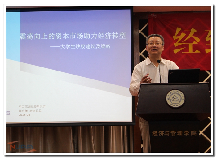 5月15日下午,由校党委研工部、校团委、经济与管理学院、金融研究所主办,校研究生会、经济与管理学院研究生会承办的“股市直通车——大学生炒股利弊与策略分析”学术沙龙在南京航空航天大学将军路校区经济与管理学院A0305报告厅成功举办。本次沙龙特别邀请了申万宏源证券研究所市场研究部副经理钱启敏、申万宏源证券南京华侨路营业部总经理王苏龙、南京百众投资管理有限公司总经理陈力以及经管学院党委书记焦宏图老师、段进东老师、徐强老师和党委研工部张廷赟老师作为嘉宾与同学们探讨了大学生炒股利弊、股市行情和炒股策略等方面的内容。 活动开始,首先由经管学院党委书记焦宏图老师为钱启敏颁发经济与管理学院金融专业兼职硕士研究生导师聘书,为王苏龙、陈力颁发经济与管理学院金融专业企业导师聘书。受聘仪式结束后,钱启敏先生围绕“震荡向上的资本市场助力经济转型”这一主题,从对国内资本市场建立之初至今几轮行情的分析出发,探讨了政策导向对股市走势的影响,并结合自身经历和丰富的经验,对大学生炒股提供了一些指导性建议。钱启敏先生的报告深入浅出,向大家提供了非常深刻独到的见解,使在场学生对资本市场有了更深入透彻的认识。