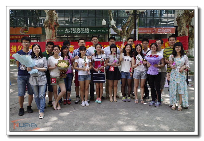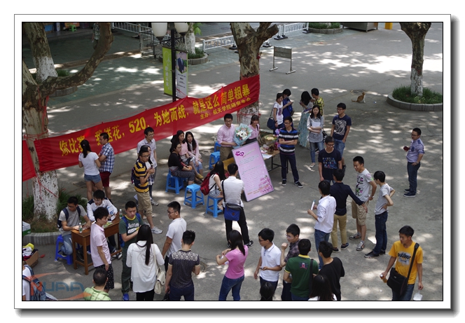 5月20日中午,航天学院研究生会特别策划“520,说一声我爱你,南航版为她而战”情侣挑战赛在明故宫二食堂门口激烈开始。研究生会的同学们按照之前宣传的时间来到指定地点,航天学院团委书记管永星也前来为这个活动捧场,本次活动采取前期报名和当场报名两种方式,做好准备工作后,同学们便开始向同学们卖力宣传:“今天520,快来为你的女朋友赢取鲜花大礼吧!”“男同胞们,有勇气为你的女朋友战斗吗?”.......开始同学们都有点羞涩,不愿意在这么多人面前“秀恩爱”,后来在主持人郭文骏同学的卖力拉拢和研会同学的激情劝说以及在奖品的“威逼利诱”下,有很多对情侣加入了进来,有的是自告奋勇的,有的是被女朋友“逼”来的,报名结束后,正式比赛开始了。