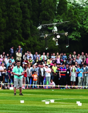 昨天,南京航空航天大学的上空格外热闹,一架架航空模型上演“飞行秀”,时而跳起芭蕾,时而变身体操王子……在航模表演中,2015年全国航空模型公开赛(南京站)暨“飞豹杯”第七届南京航空航天大学航模节拉开帷幕,来自全国28支参赛队的130名队员,用手中的航模放飞属于他们的航空梦。值得一提的是,今年航模赛有一个最大特点,就是新增“空对地摄影比赛”这一项目。 现代快报记者注意到,本次航模大赛共有7个比赛项目。其中,“无线电遥控多旋翼飞机空对地摄影竞赛”首次出现在赛程单上。通俗地说,也就是航拍竞赛。 对此,南航科学技术协会副秘书长刘双丽介绍说,针对越来越多的航拍技术在工作、生活中运用,他们特意增加了这个比赛项目,旨在让学生对此有更多的了解。而该项目的比赛规则和计分模式都是全新的。 据航拍竞赛项目总裁判朱国鸣介绍,该项目共16名选手参加。要求参赛者在“U”形线路上定点拍摄,以照片拍摄的精准程度来计分。朱国鸣向现代快报记者解释道,他们一共设计了8个点。在每个点上,参赛者都要航拍一张十字图标的照片。而裁判评判有三项标准,一是看十字图片的中心点与照片正中心的距离。距离越短,分数越高。二是看十字图标的短线与航向边之间的夹角。最后还要看十字图标的短线与长线的比值。