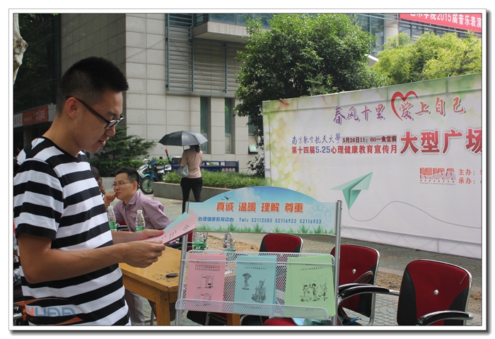 5月26日中午,由学生处、研究生院主办、心理健康教育中心承办的第14届“5.25”心理健康教育宣传月大型之广场心理咨询活动在明故宫校区举行。本届心理健康教育宣传月,以“春风十里,爱上自己”为主题,号召广大师生在南航校园传递关注心理健康的和煦春风,用自己的行动呵护自己心灵的成长。 本次广场心理咨询共邀请到来自南京理工大学、南京师范大学、南京农业大学、南京医科大学、南京信息工程大学的心理中心主任作为心理咨询专家为现场师生提供一对一的现场咨询服务。活动受到了本部研究生和高年级本科生的热烈欢迎。早在11点活动正式开始前,就有几位同学提前来到心理咨询台前等待,期待第一时间与专家畅聊心中的烦恼。 整个活动持续近两个小时,共有二十多名同学与专家们倾心交流。在专家们耐心的倾听和专业的指导下,同学们解开了学习、压力、恋爱、人际交往等方面的心理困惑,增进了对自己和问题的了解,学习了积极的压力应对技巧,为今后维护自身心理健康积累了丰富的知识储备。 本次活动是我校第14届“5.25”心理健康教育宣传月系列活动之一,其成功举办不仅在明故宫校区普及宣传了心理健康和心理咨询的知识,更推动了广大师生对于我校心理健康教育工作的了解与重视,在5月25日大学生心理健康日之际,掀起了“爱自己、爱他人”的心理春风。据了解,本届5.25心理健康教育宣传月系列活动将持续到六月上旬,此后还将开展心博会、心理知识竞赛、心理素质拓展等活动。 ![]() ![]() ![]() |