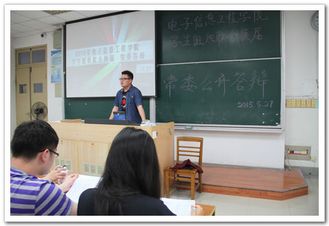 5月27日星期三,电子信息工程学院学生组织联合换届常委公开答辩在6102成功举办。答辩由现任学生会主席薄磊主持。到场的教师评审有:电子信息工程学院团委书记张晓燕老师,辅导员周贞琪老师、冷阳老师;专业评审团由上任四大组织主席和现任四大组织主席团组成;大众评审团由四大组织代表、各年级代表以及候选人亲友团组成。 此次学院学生组织联合换届中,因学院新成立新闻中心这第五大组织,以及新增加了部门,学生骨干的需求增大。此次常委公开答辩中,26位候选人就学院五大组织的16个常委职位展开了激烈的角逐。 答辩伊始,主持人介绍了到场嘉宾及答辩规则,与会人员对到场的嘉宾及评委致以热烈的掌声。答辩在紧张而友好的气氛中正式开始,每位候选人有四分钟的时间进行自由陈述,然后随机抽取问题并作出回答,最后由所有评审进行自由提问。答辩中群英荟萃,每一位候选人精心准备的答辩都充分地表现了自己,并表达了他们为同学服务的意愿和信心,同时对我院五大组织以后的工作进行了展望,现场不时爆发出热烈的掌声。展示环节之后,评审团本着公平、公正的原则给出了自己对各候选人的评分。 持续三个多小时的选举大会在热烈的掌声中落下帷幕。此次公开答辩秉承民主、公正的原则,五大组织新一届常委的名单会在学院综合统计评选结果后给出。充满活力与热情的新一届常委们会给我院的团学工作注入新的血液,标志着我院五大组织一段崭新的发展历程即将开始。全新的五大组织会在未来的工作中秉承前人的优良传统,继往开来,更上一层楼! ![]() ![]() ![]() |