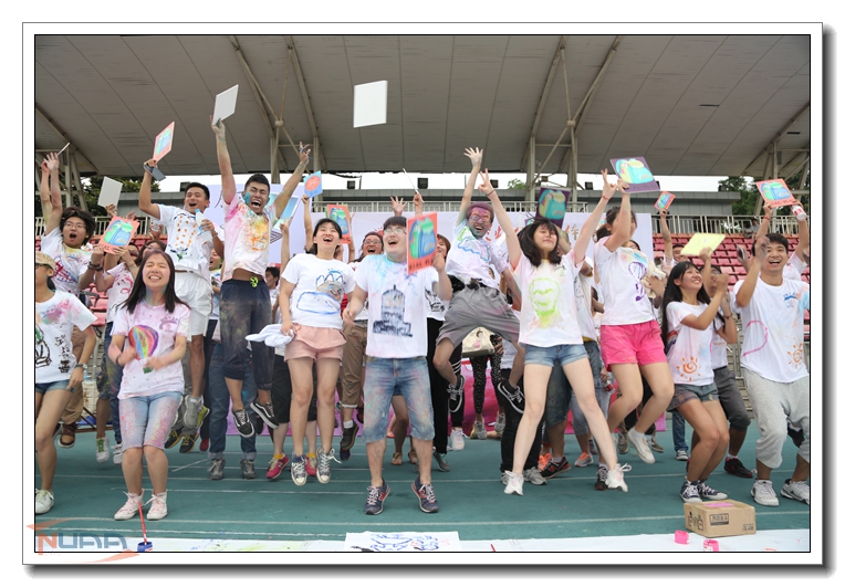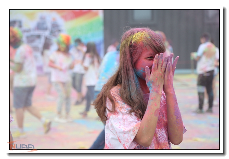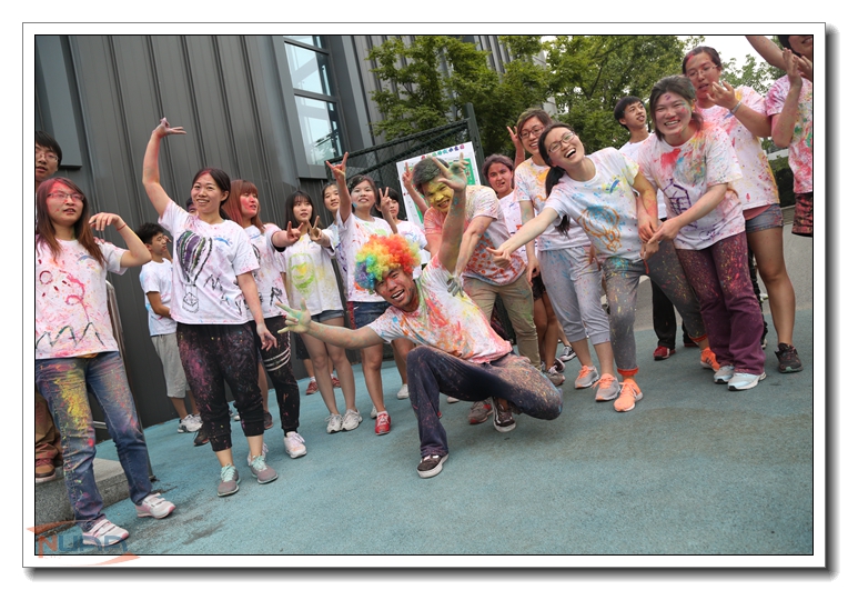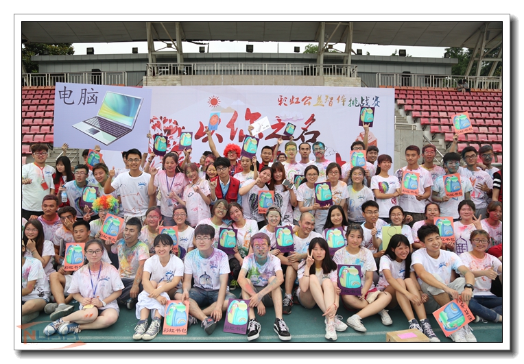 在最激动人心的撒粉环节中,选手们每人一袋彩色玉米粉,在规定场地中间靠拢。在主持人一声令下后,场地中的选手争前恐后的相互掏出玉米粉撒向周围的人。一轮撒粉比赛过后,选手们从头到脚布满了七彩的玉米粉,有的同学衣服上还有各种颜色的手印,有的同学眼镜上更是蒙上了厚厚的一层粉。大家欢笑奔跑,气氛热烈。彩虹跑环节中,随着主持人的口令,选手们争相跑出,开始了围绕校园一圈的长跑。配合着选手们七彩的装束,整个长跑队伍就像一条游动的彩虹,在校园中传递着灿烂的色彩。完成所有挑战的同学们汗流浃背、气喘吁吁地到达终点,当拿到自己努力募得的成果时,大家都兴奋地和队友拥抱欢呼。