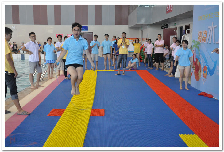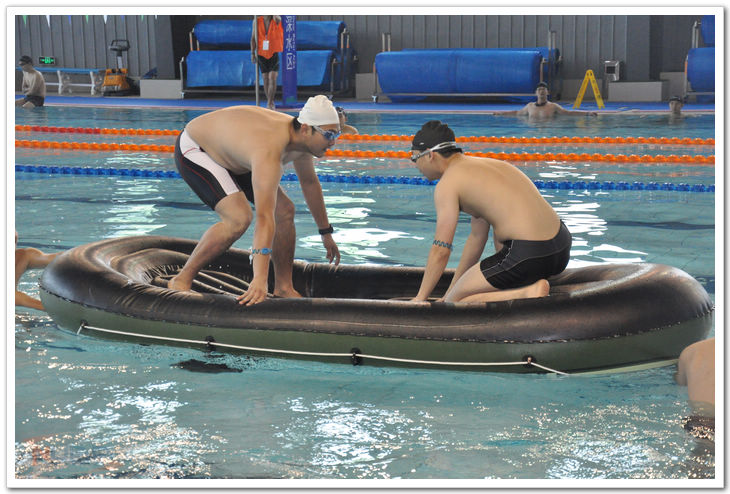 素质拓展活动按照年级工作组划分参赛队,并且富有创意性地以青龙、白虎、玄武、朱雀、乾坤命名。比赛项目有考验默契度和合作力的“呼吸机”,有考验灵巧性与协调性的指压板竞技,还有考验个人身体素质的游泳接力和考验力量与胆识的“攻占皮筏艇”。