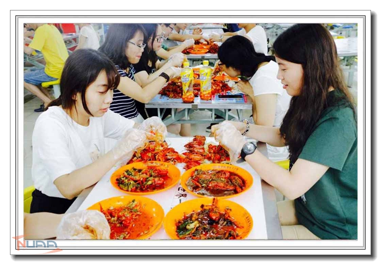 “轻轻牵起手,掀起红盖头,深深吸一口,脱下红衣裙,美味就到口!这是吃龙虾的小口诀,你们还知道啊?”吃的正高兴的王同学向同学们演示着吃龙虾步奏。一位一边吃一边给吃过的龙虾头进行排队的小姑娘吸引了同学们的注意力,“这些龙虾头全是我的战利品,我把它们排排好,吃完数数总共吃了多少”她不好意思说;“这个龙虾口味真的很赞,甩外面的好几条街,这虾子个头虽然不大,但虾的品质真的很好,肉很实、很新鲜。我要在试吃员反馈表上打五颗星”试吃员韦同学对本次的龙虾如此评价道。