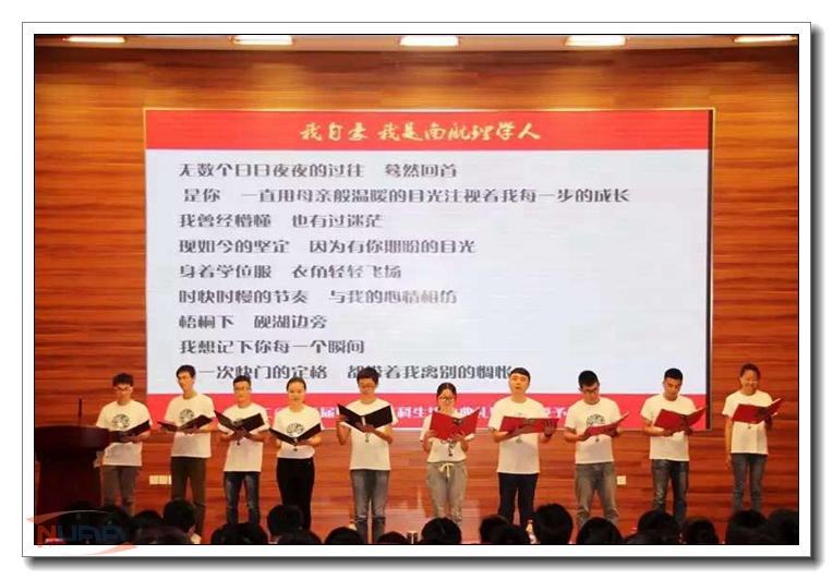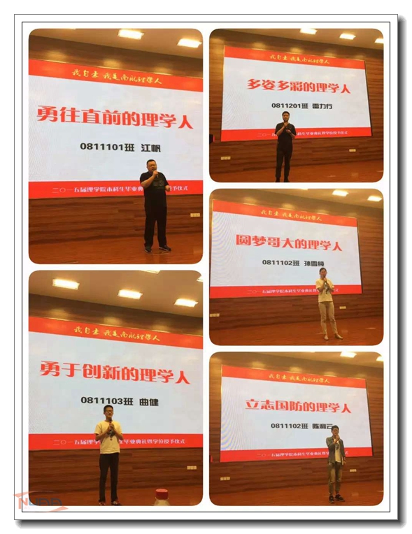 6月17日下午,南京航空航天大学理学院2015届本科生毕业生典礼暨学位授予仪式在一号楼四楼报告厅举行。教务处副处长阎志军、理学院党委书记余春玲、院长施大宁等学院党政领导、系领导、教师代表、学生家长代表、2015届毕业生以及全体1-3年级本科生参加了毕业典礼。 创意毕业照,留下最美瞬间