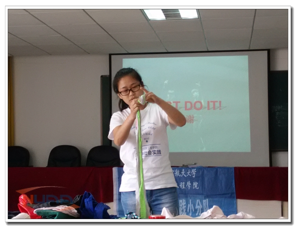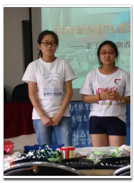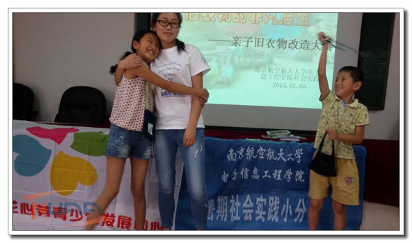 2015年7月5日电子信息工程学院“旧衣物的非凡后生”暑期实践团队在雨花台金叶花园举办了旧衣物的非凡后生之亲子旧衣物改造大赛。