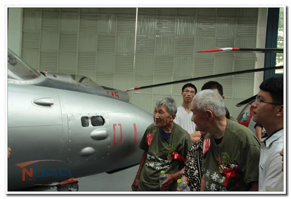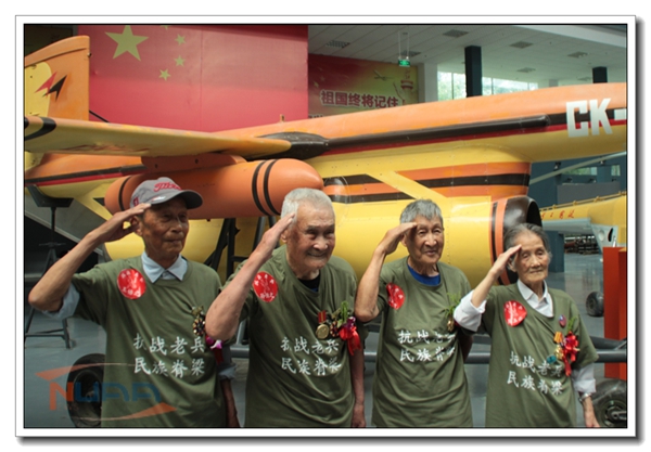 七月五日,四位抗战老兵孙恒之、徐沅甫、周玉云、王陪之应邀来到南京航空航天大学明故宫校区参加活动。活动主要由两部分组成,一是参观南京航空航天大学航空馆,感受近现代我国航空事业的发展态势,而是在宽敞的教室中和同学们近距离交谈,新老谈话间是精神传承。 中午二时许,四位老兵在专车接送下抵达南航明故宫校区大西门。在接受南航学子简短的欢迎仪式后,四位老兵在同学们的陪同下前往参观南京航空航天大学航空馆。参观过程中,老兵们十分认真的听着讲解员解说,时不时还抛出几个问题、探身看看飞机内部结构、讨论飞机某些零部件的作用,最后,回顾历史,对我国航空事业的发展表示了赞叹。深邃的眼神、标准的敬礼,老兵们在航空馆内国旗下的军礼合影又一次展现了军人的风采。