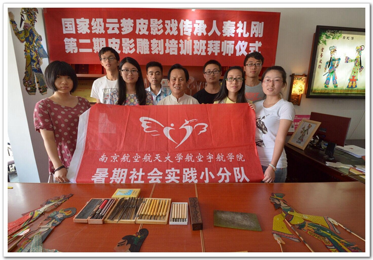 从五湖四海而来 据团队成员介绍,团队从7月4日晚于南京出发,在次日下午抵达暑期社会实践地点湖北云梦,并受到国家级非物质文化遗产传承人秦礼刚秦老师的热情迎接。在接下来的十二天当中,一行人拜云梦皮影掌门人秦礼刚为师,历经绘制纸质模板、裁剪、雕刻、上色、晾晒、连接、装竿等一系列过程,失败就从头再来,不会就积极请教,才最终完成两部主题皮影的全部人物皮影的制作。而两部皮影剧目,分别是以“航空人精神永不朽”为主题的“冯如传”及以“民族抗战精神永不朽”为主题的“鸡毛信”,他们将以此宣扬航空精神并为纪念世界反法西斯战争胜利70周年献礼。 团队一行十人人,分别来自八个不同的省份,在生活习惯方面难免有所不同。在整个社会实践过程当中,生活上他们互相照顾体谅;工作上他们分工合作齐心协力,结下了深厚的友谊。来自南航大飞行器设计与工程专业的陈子雄同学笑着说道:“大家可以说是来自五湖四海,正是对于传统文化,对于皮影的热爱与兴趣,让我们走到了一起,并最终成为了亲密的好友!” ![]() 克服重重困难前进 然而皮影的制作却不是一件十分容易的事情。实践团队一行八人在云梦皮影戏大师秦礼刚老师的指点下,从曾经的生疏费力到如今的熟练轻松,付出的汗水与精力是值得点赞的。一个皮影人物的制作,需要经过绘画、刻印、雕刻、修整、打磨、热处理、上色、连接等一系列复杂的步骤。作为初学者,团队成员也是克服了重重困难才有了今天的成就:材料太硬剪刀剪不动就男生专责裁剪,刻刀硌得手起了水泡就拿创可贴包着继续刻,雕刻快结束时材料开裂又一切从头来过。正是这种团队成员紧密协作,肯于吃苦的精神,让他们在短短半个月的时间内,取得了令秦老师赞不绝口的表演成果。 皮影制作完成后,皮影的表演也是一个十分困难的工作,团队为此进行了明确的分工:音乐节奏感好的同学负责皮影背景乐的剪辑工作,文笔较好的同学负责皮影剧本的进一步修改完善,其余人则认真学习皮影的各种抖动的技巧方法。秦老师告诉同学们:“皮影的表演,要注意人物的动作和台词的配合,还要注意要放得开,不要拘谨。皮影是声音与图像的双重艺术的综合,只有多练,才能正真将皮影表演好。”