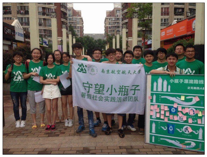 暑假来临,由南京航空航天大学校团委组织的暑假社会实践活动如火如荼的进行着,为了“践行社会主义核心价值观,筑文明和谐新南京”,该校材料科学与技术学院23名同学组成了“守望小瓶子”团队,走上街头、深入社区进行塑料瓶知识普及和呼吁塑料瓶回收再利用。 每天都有无数的塑料瓶在产生,在被使用,在被遗忘。茫茫人海没有人注意过它们何去何从,它们如沧海一粟,毫不起眼,其实却发挥着重大的作用。有多少人认识到对它们的依赖?“守望小瓶子”团队,旨在让人们看清塑料瓶的从生产到回收处理的各种环节,并进一步挖掘小瓶子上的信息,让人们能对小瓶子有一个深入的了解。
