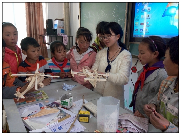 在教给了学生们一些基础的飞机飞行原理之后,“益理科普”支教团的团长,也是i理科普小站的站长李松老师拿出了160架橡皮筋飞机。孩子们满怀好奇与渴望,目不转睛地看着老师们是怎么做的。