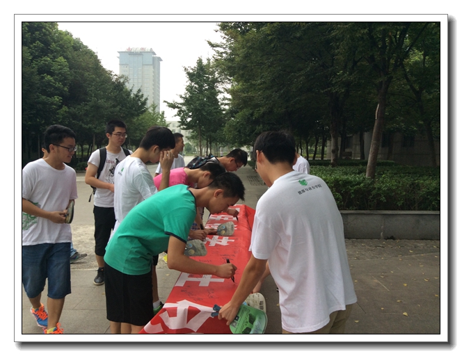 我们的公益宣传活动大概持续了一个半小时,期间我们分发了一百多把宣传扇,有几十名学生在我们的横幅签名,为保护环境许下承诺,贡献着自己的力量。我相信通过这次活动,他们的环保意识会得到提高,他们也一定能从自身做起,去保护环境。当横幅上密密麻麻签满参与者的名字时,我们能感觉到他们保护环境的决心与防治pm2.5的强大动力。看着一个个签名,我们感受到我们不是一个人在战斗,在保护环境的路途上我们并不孤单,但同样我们感受到了责任,我们需要更加努力才能实现更为远大的目标。