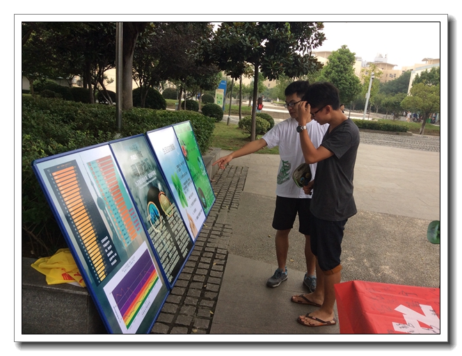 早上十点,我们的团队来到樱花广场对面,艺术中心与体育中心之间的广场上准备好相关设施。我们将pm2.5的相关展板按顺序摆好,摆好桌子,摆置好横幅。我们首先分发宣传扇,宣传扇上印有pm2.5的一些基本概念和pm2.5的来源等相关科普知识,我们希望借此方式能更好的宣传我们的活动。然后我们会邀请一些同学来我们的横幅——“争做环保使者,共建绿色家园”上签名,许下自己保护环境的庄严承诺。学校里的同学也都非常支持我们的活动,他们有的人会向我们询问南京的pm2.5状况,以及我们学校周围的空气状况如何,我们则会用展板上的详细数据向他们说明清楚,耐心解答他们的问题。大部分同学也认真观看了我们的展板,并向我们询问了相关问题,我们在交流过程中对于保护环境的重要性及迫切性达成了共识。当同学与我们交流的时候,我们能感受到他们对于环境至少是南航校园周围的pm2.5以及环境状况都十分关心,我们能感受到他们身上强烈的社会责任感。pm2.5这个名词在我们的生活中出现的越来越频繁,雾霾天气的增多也迫使我们采取措施去解决这个棘手的问题。