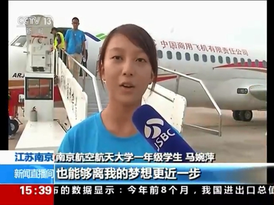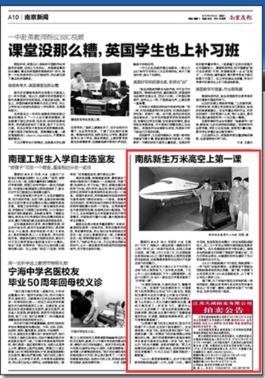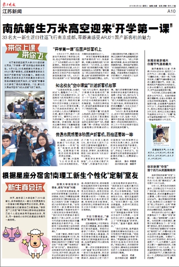 9月6日至7日,我校33名本科、研究生新生及部分教职工代表亲身体验ARJ21国产新客机从南京到成都的往返航线,在飞行途中进行了主题新生教育,活动取得了圆满成功,并得到了中央电视台、中国教育电视台、江苏电视台、新华日报、现代快报、扬子晚报、新华网、光明网、中国新闻网、凤凰网、澎湃新闻网等十余家国家级、省市级媒体的报道。通过这些报道,集中展示了南航人才培养和特色办学的理念,为学校赢得了良好的社会声誉。 附:相关媒体报道 ![]() 中央电视台新闻频道 ![]() 中国教育电视台 ![]() 南京晨报:http://njcb.jschina.com.cn/mp3/html/2015-09/08/content_1305505.htm ![]() 南报网:http://www.njdaily.cn/2015/0907/1208430.shtml#g1208427=1 ![]()