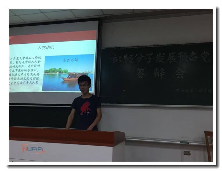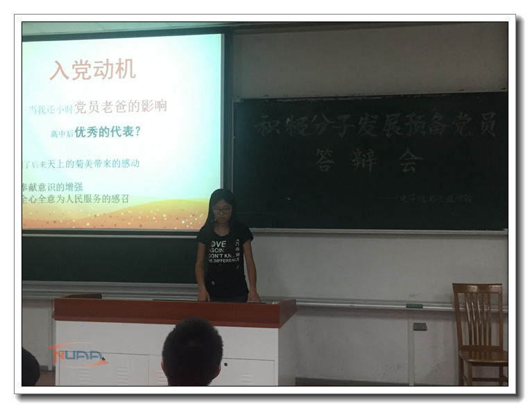 9月16日晚,电子信息工程学院2013级入党积极分子发展预备党员答辩会在6201教室举办。 本次答辩会的评审团由2013级辅导员周贞琪老师,0413党支部成员以及来自本学院的31余名学生代表组成,共有14名积极分子参与本次预备党员答辩。 晚六点半,答辩会在主持人的宣告下拉开序幕。14名预备党员按照抽签顺序分别从自我介绍、入党动机、工作能力、优缺点分析以及奖惩记录等方面依次进行了个人汇报。每位积极分子展示完毕后,党支部成员和大众评审据其汇报中的情况进行提问,大众评审的投票作为答辩成绩的重要参考。答辩现场,学生代表认真聆听,投票积极,气氛活跃,正常答辩不仅体现了入党积极分子和学生代表对党员发展的关注,也体现大家对党员发展质量的关注,很多独到和深刻的问题也引发答辩者更加深入的思考才能更好回应面对评审团或尖锐或严肃的提问,积极分子们谈吐自然,应对自如,幽默风趣的回复也不时引来现场的阵阵喝彩。