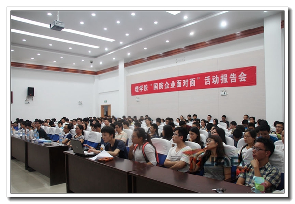 9月16日下午4点,理学院在学院报告厅举办了2015国防企业面对面报告会。学院党委副书记王静、应用物理系主任阚彩侠、数学系主任蒋建林、材料科学技术学院系主任常树全到场参加,来自理学院和其他学院的近两百名学生参加了本次交流会。活动由学院团委书记王亚鹏主持。 8月9日至13日,理学院赴四川地区开展了“国防企业面对面”专项实践活动。由理学院党委副书记王静带队的走访团,五天内共走访了六家单位。此次报告会的宣讲团由今年理学院国防企业面对面活动的师生组成,主要面向今年的准毕业生、即将开启职业规划的大三、研一学生,从国防企业情况介绍、就业形势解读、人才素质需求、大学生生涯规划等方面进行宣讲。