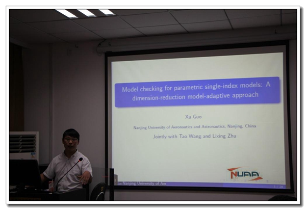 接着,活动主持人虞先玉老师介绍了本次活动主讲人郭旭老师的学术背景和研究成果。郭旭老师首先介绍了自己的个人基本情况以及近期做的一些科研工作。郭旭老师近期和王建立老师的博士生导师李静远老师合作的一篇文章已经基本被Insurance: Mathematics and Economics接受(Conditional Accept)。郭老师对此非常感谢学院经常进行的学术交流,使得他有机会和王建立老师以及李静远老师进行学术合作。郭老师对模型检验进行了介绍,并分享了其研究过程中的启发和感悟。汇报结束后,朱建军、王英副院长,周鹏教授,宋连莲老师,虞先玉老师、蒋昕嘉老师和郭旭老师就学术研究以及一些统计学的概念进行了交流讨论。整个报告会中,参会的老师们都积极参与学术交流,会场气氛轻松活跃。