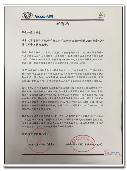 2015年度CCF-腾讯犀牛鸟科研基金评审结果日前公布,计算机科学与技术学院黄圣君老师获此殊荣。中国计算机学会、腾讯科技(深圳)有限公司在致聂宏校长的祝贺信中这样写到:犀牛鸟基金评选堪称优中选优,黄圣君博士从激烈的竞争中脱颖而出,充分展示了其优秀的个人素质、卓越的研发能力、创新的思维模式及可期待的应用前景。这是贵校积极推进教学体制改革,为青年学者成长营造一流的培养环境,支持产学研全面深入合作、提升自主创新能力的直接体现。 CCF-腾讯犀牛鸟科研基金是由中国计算机学会、腾讯科技有限公司联合发起。该基金自2013年成立以来,吸引了海内外150多所高校、科研院所近500位青年学者提交申请,在顶级会议及期刊发表论文80多篇,申请国际国内专利50多项。据了解,本年度基金在2013、2014年度基础上进一步激活信息能源,激发技术、思维及合作模式的创新,还引入“腾讯文智中文语义开放平台”,让研究者跨越自然语言处理、文本处理、转码、抽取、全网数据抓取等中文语义分析的瓶颈,为研究者提供大数据语义分析一站式解决方案。经专家组函评及现场决议,综合考量申请课题的前瞻性、思维创新性、应用可行性及团队执行力等综合因素,最终确定20项申报获得科研基金资助,入选比例约为12%。项目评审结果已在CCF官网、腾讯高校合作官网及大众媒体全面公布,并将于2015中国计算机大会(CNCC2015)颁奖晚宴上为获奖者颁发证书。 ![]() |