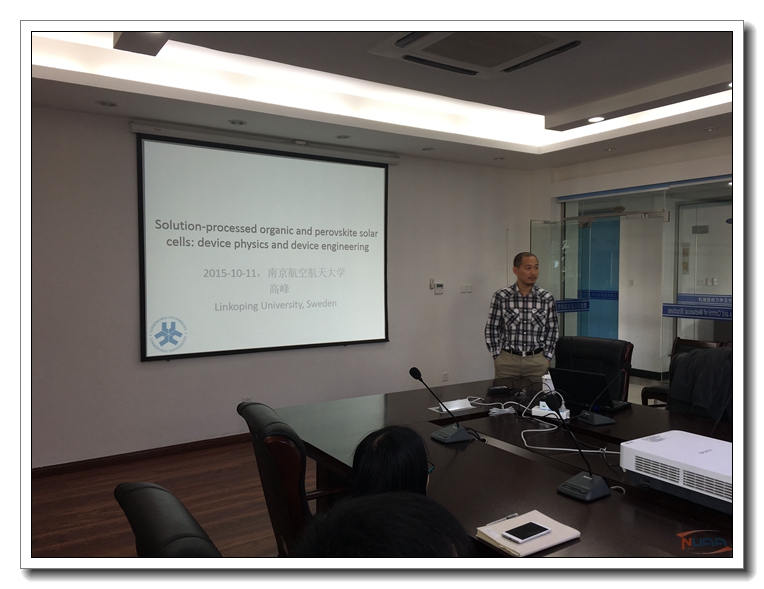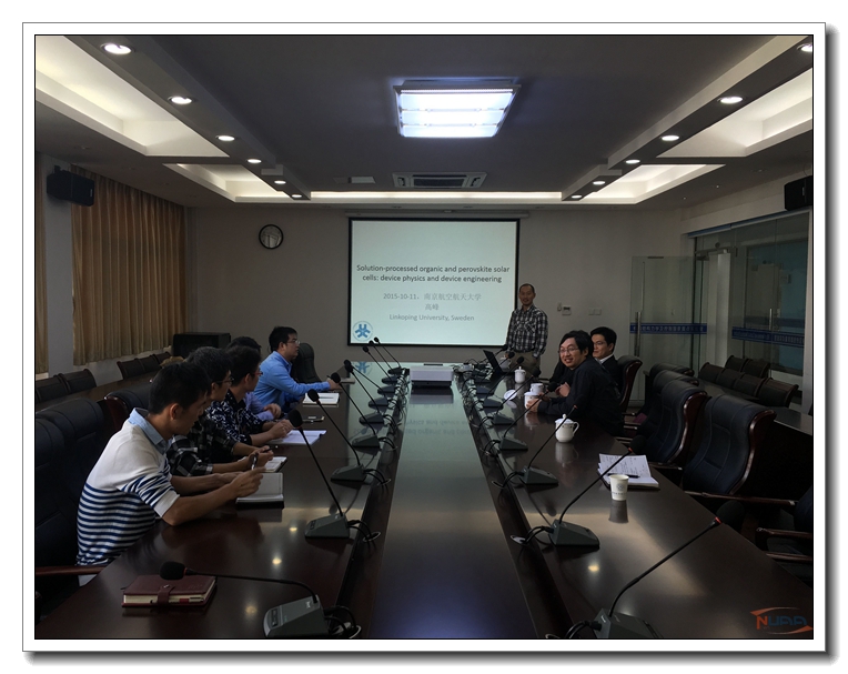 应我校机械结构力学及控制国家重点实验室杨颖教授邀请,瑞典林雪平大学高峰博士于2015年10月11日至14日访问了我校,并于10月11日为我校师生做题为“Solution-processed organic and perovskite solar cells:device physics and device engineering”的学术报告。 ![]() 报告内容丰富、生动、精彩,综述了燃料敏化电池的相关知识,介绍了太阳能电池等材料,对我校今后的相关工作具有借鉴作用;同时,高峰博士还结合自己多年的研究经历,讲述了有机物太阳能电池和钙钛矿型太阳能电池的若干问题。杨颖教授主持了此次报告。 10月11日下午,高峰博士在杨颖教授的陪同下参观了我校机械结构力学及控制国家重点实验室,并与我校杨颖教授课题组就共同关注的太阳能电池研究领域进行了探讨和交流,对杨颖教授课题组正在从事的压电、热电材料及其应用领域的研究产生了浓厚兴趣。此次交流访问明确了瑞典林雪平大学和我校重点实验室的以光伏新材料作为长期合作方向,达成了联合培养研究生和相互交流的合作意向,对于增强我校与瑞典林雪平大学之间开展学术交流以及合作研究将起到积极的促进作用。 ![]() 高峰博士在英国剑桥大学卡文迪许实验室获得博士学位,多年从事有机太阳能电池的器件物理研究,对多种材料体系的电荷损耗机理进行过深入细致的研究。现任瑞典林雪平大学物理化学和生物系助理教授,主要从事新型太阳能电池和发光二极管的研究,包括有机半导体材料和有机-无机杂化钙钛矿半导体材料。迄今为止,高峰博士已在Advanced Materials,Physical Review Letters,Journal of the American Chemical Society,Nature Communications等期刊上发表学术论文50余篇。 ![]() ![]()
