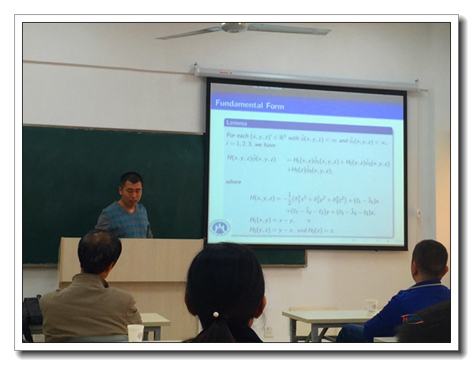 10月30日上午,““枭龙杯”第十七届研究生学术论坛之“理”想分论坛在理学院547会议室举办。本次学术论坛邀请了法国Blaise Pascal大学副教授Hacène Djellout和山东财经大学统计学院副教授戴洪帅,分别做题为 “Deviation inequalities ,moderate deviations and some limit theorems for bifurcating markov chains with application”和“Exact tail asymptotics for a three dimensional Brownian tandem queue with intermediate inputs”的学术报告。 ![]() Hacène Djellout是法国Blaise Pascal大学副教授,于2000年在Blaise Pascal大学获得博士学位,导师为吴黎明教授。他主要从事偏差不等式及大偏差理论等方面的研究工作,发表学术论文二十余篇,包括The Annals of Probability,The Annals of Applied Probability等概率领域Top杂志,以及Stochastic Processes and Their Applications, Annales de l'Institut Henri Poincare Probabilites et Statistiques等概率统计领域权威杂志。 戴洪帅是山东财经大学统计学院副教授,硕士生导师,分别于2006年和2010年在中南大学获得理学硕士及博士学位,并于2008.9-2010.3访问密歇根州立大学。他主要从事随机分析,排队论、应用统计及数理金融等方面的研究工作,发表学术论文二十余篇,包括Bernoulli,Journal of Theoretical Probability等概率统计领域权威杂志。他曾先后主持多项国家自然科学基金地区项目及广西自然科学基金项目。 报告会上,Hacène Djellout副教授介绍了一些极限定理和一些概率不等式(BMC),第一中偏差原理(MDP),superexponential依概率收敛和偏差不等式(或高斯设置或限制的设置)。通过聆听报告,同学们更深入的了解了概率的相关知识,以及中外学术的差异和优缺点。戴洪帅副教授介绍了三个二维布朗驱动的串联队列中间输入,在这个串联队列的缓冲内容的过程可以模拟由一个反射布朗运动。在稳定的系统中得到了确切的尾渐近性的三次缓冲区内容的边际平稳分布。戴洪帅副教授在报告过程中幽默风趣,师生们积极提问,戴副教授对大家提出的问题进行了详细的解释让同学们对相关的数理知识有了更深入的理解。 理学院的“理”想分论坛通过邀请知名专家、学者到场交流,营造浓厚的学术文化氛围,不断提高研究生的学术素养,增强研究生学术交流意识,培养良好的学术道德和科学精神。 |