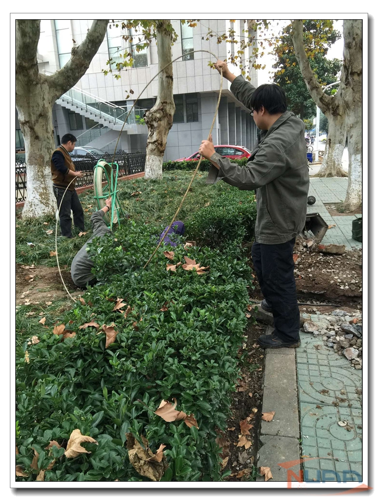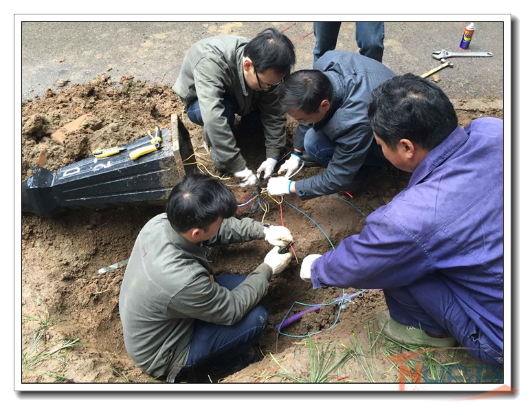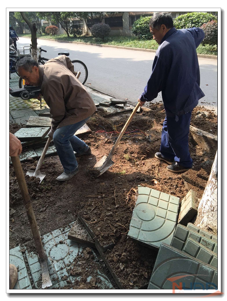 次日一早,中心主任带领维修班组及工程技术部人员赶赴现场,首先对故障区域的8座灯杆进行拆除后分段检查绝缘,经检查发现,因电线埋设时间较长,部分绝缘老化引发短路,并因施工局部损伤等因素,电线故障点长期发热击穿,引起区域性线路损坏。故障原因查明后,于是立即制定抢修方案,一组人负责破开灯座后侧的人行道砖,并开挖部分电缆沟,一组人准备电缆材料重新敷设线路,各项工作有条不紊的进行,为了尽量减少绿化损坏面积,年轻人主动钻进狭窄的电缆沟内引导电缆敷设。抢修人员放弃中午休息时间,并在天黑时利用手电筒等临时照明设备继续抢修至晚间6点钟。抢修工作持续进行中,至12号上午,天空飘起了小雨,中午时分,小雨渐大,为了能够尽快恢复路灯照明,工作人员冒雨施工。本次抢修共计敷设了900多米电线和300米电缆,最终于12号下午3点完成全部抢修工作,恢复了所有故障路灯供电。