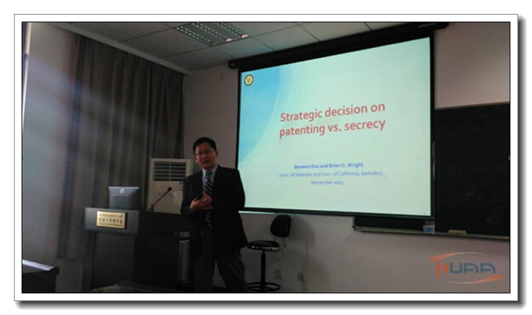 11月5日下午在东区经济与管理学院大楼704,加拿大滑铁卢大学管理科学系的Bonwoo Koo教授来智能决策与风险分析研究所和区域经济与产业经济研究所,作了“Strategic decision on patenting vs. secrecy”的报告。经管学院的副院长王英老师,智能决策与风险分析研究所的陈晔、陈洪转、李杰等老师,区域经济与产业经济研究所的苗建军、江可申等老师以及两所的全体研究生同学参加了此次报告。 ![]() Koo教授研究领域包括知识产权、科学技术政策、创新战略和技术管理、技术应用与扩散、遗传资源经济学、生物技术、绿色技术等。他在Journal of Financial Stability等众多国际知名期刊发表过多篇文章。 Koo教授在报告中主要分析了专利与商业秘密这两种结构,分析如何对这两种类型权利进行保护激励,设计最佳的知识产权政策。专利是政府授予的垄断权,在一段时间内保护个人创新。而商业秘密是一种社会控制,以限制许多其他公司的进入。商业秘密具有较短的专利寿命,具有广泛的专利范围,可以使公司的专利权得以不断创新。报告期间,多位老师同学对相应的问题进行交流,现场氛围十分活跃。他的精彩报告给参加讲座的老师和同学带来了许多启迪与思考。最后Koo教授的精彩讲座在全场同学们热烈的掌声中圆满结束。 |