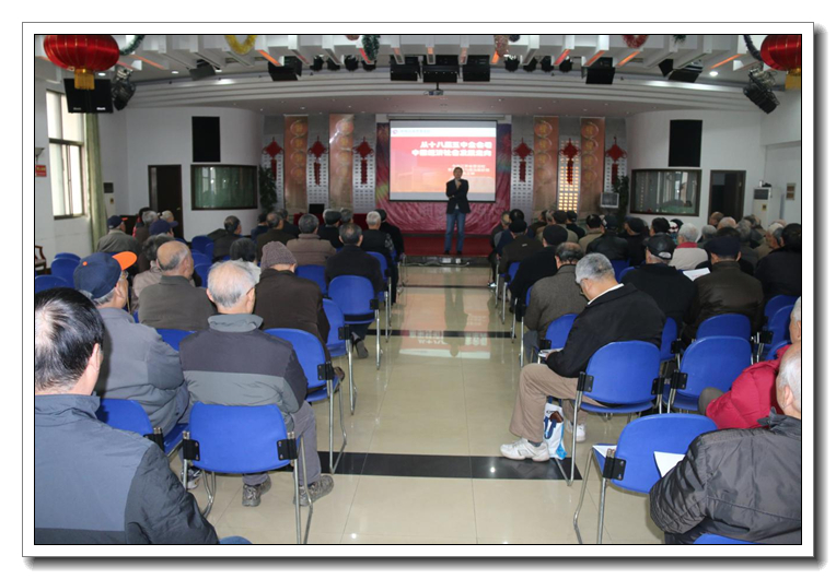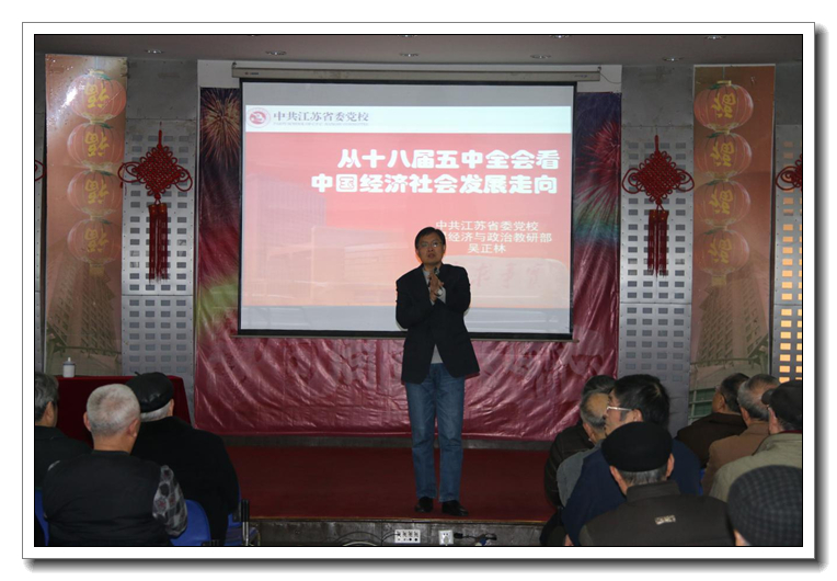 12月1日上午,为学习贯彻十八届五中全会精神,离退休处特邀江苏省委党校吴正林教授在西苑教职工活动中心多功能厅为我校离退休老同志做了题为《从十八届五中全会看中国经济社会发展走向》的形势报告会。离退休党支部支委、群众组织负责人以及离退休联络员等近200名老同志听取了报告,报告会由离退休处处长刘虎主持。