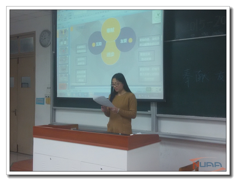 航天学院青年志愿者协会2015—2016上半学年工作总结会于昨日晚七点在6103教室准时开展。青协全体成员与周围同学积极交流着这一个学期以来的工作与收获。 ![]() ![]() 青协主席马浩君再次向大家介绍了青协的工作目的,青协的精神理念,以及向大家汇报了本学年的工作概况,之后主席对青协过去一学期的所有工作做了整体总结。有值得欣慰的地方,也有不足之处。他说青协成员要反思不足,积累经验,才能把志愿服务做得更好。他也希望大一干事们不忘初心,努力进取。 活动部部长廖英可首先上台。他向青协全体成员们介绍了过去一学期里活动部的工作流程和具体的活动过程。活动部在过去一学期里,共开过七次部门例会,部门内部关于一个活动也有过多次商讨和改进,他们取得了不菲的成绩,但自我感觉仍有不足,在反思、总结过后,活动部成员有信心改善不足,在以后的日子里做得更好。 航天学院团委书记管永星对于青协以后的发展,提出了以下三点。 首先,是“有志者事竟成”。 管永星介绍了航天学院的发展后,表示希望将青协建设得更好。第二点是我们应该用专业的能力去做志愿服务。另外,管永星老师告诫到场人员,青协尚处于刚刚建立的阶段,青协的所有人都应在这里找到自己合适的位置,要敢想敢做,勇于去实现自己的理想。 第三点,众人拾柴火焰高。青协是一个团队,无论青协的哪个成员,都是它的一份子,青协的成员应该让青协成为动力,不断将新想法付诸于实践。 最后,管永星希望可以带动更多的人加入到航天青协的志愿服务活动中来,也希望在下一学期看到航天青协所有成员更好的表现。 ![]() ![]()