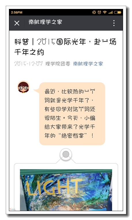 2015年为联合国确定的“光和光基技术国际年”,以此纪念千年来人类在光领域的重大发现。为传播光和光基技术知识,传承数理文化,引领同学们追求真理,近日,理学院以“光耀世界”为主题,组织开展了相关学术讲座、研讨会等活动。 线上线下宣传, 普及光学知识 自11月中旬起,理学院微信公众平台“南航理学之家”定期推送光学知识,使光科学知识的普及深入到每位同学心中。在学院楼大厅内,制作摆放“光学千年”科普宣传展板,普及千年来人类在光领域的重大发现,宣传光技术带给人类文明的进步,正式拉开了2015国际光年系列活动正式启动的帷幕。 举办学术讲座,拓宽科学视野 11月20日-12月1日,先后组织开展了光知识普及系列学术讲座。其中,邀请到物理系副教授李晋斌举办讲座“中微子振荡:从川剧变脸到星际通讯”,受到了同学们的高度好评。12月1日,邀请东南大学教授崔一平举办“国际光年谈光学”科普讲座,为同学们介绍了国内外光学科技的最新研究进展。通过讲座,同学们不仅对光学相关知识有了更全面深入的认识,对科学探索、创新、坚持的精神也有了新的体会。 举办“师生会客厅”,提升科学素养 “老师,您对光电技术的应用有什么看法?” “老师,您觉得光学将会有怎样的发展趋势?”在学院“师生会客厅”活动中,同学们分别邀请了院长施大宁教授、物理系副教授李晋斌老师,共同探讨了光技术在航天航空、生命科学、军事等领域的广阔前景,对光学的发展与应用有了更深的见解。 举办班级研讨会,促进交流分享 学院各班级也分别举行了小微化的“光学知识探讨会”。研讨会上,每名班级同学就给定的与光电专业相关的命题进行了5分钟的演讲,同学们畅所欲言,讨论热烈。通过交流分享,增强了同学们的社会责任感,激励他们进一步投入到学习实践中。 ![]() ![]() ![]() ![]() ![]() ![]() |