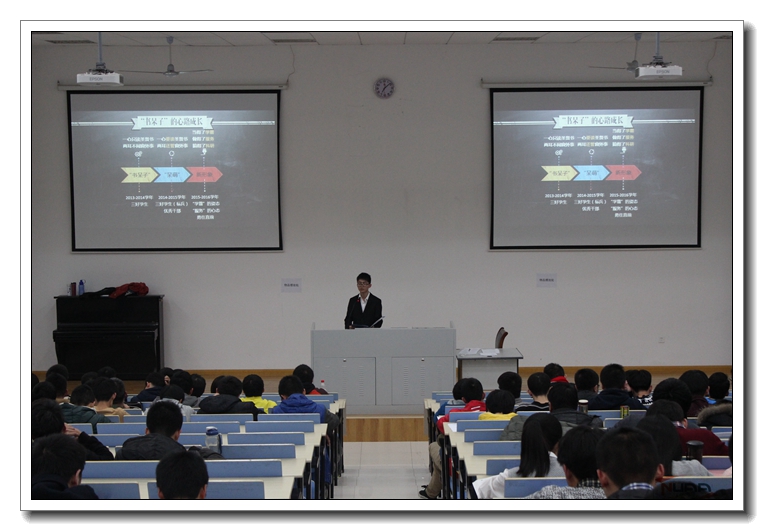 笃学篇是2013年级优秀学生代表分享自己的学习经验。年度特别嘉奖之笃学奖的获得者100班缪俊杰同学与园丁励志奖学金一等奖的获得者101班的卢阳天同学分别讲述了自己的精彩故事。缪俊杰同学优异的成绩与平日里的勤奋刻苦分不开,卢阳天同学更是通过的实际经历证明了这一点。他从濒临退学的境地蜕变为如今成绩优异的典范,这与他不服输、不认输、死磕到底的精神分不开。求是篇由102班江宽同学与201班方涛同学来主讲,他们分享了自己奔跑在创新、创业的道路上,他们求真务实、求是严谨的精神值得我们学习。奉献篇由获得我校学风引导类“优秀团队”荣誉的APU启航团来主讲。自APU启航团成立以来,陆续帮扶了近60名学困生。在他们的努力下,解决了很多同学学习上的困惑,缓解了学困生与家长之间的矛盾。另一主讲团队是我校第一批卓越班之0213109班,该班级追求卓越、后来居上的拼搏精神是很赞的,在今年的评优评奖中获得了校“标兵班级”的荣誉。