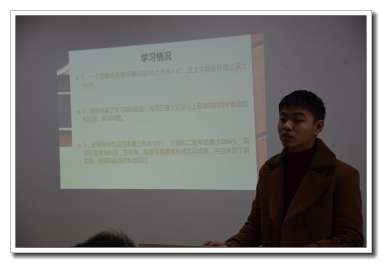 ![]() 随着班级工作汇报的结束,辅导员周贞琪老师对年级工作进行了总结发言,并组织中心组学生干部为在场同学准备了学院的小礼物以表达对同学们的新年祝福,使得现场气氛更加活跃,为整个总结大会画上了完美的句号。