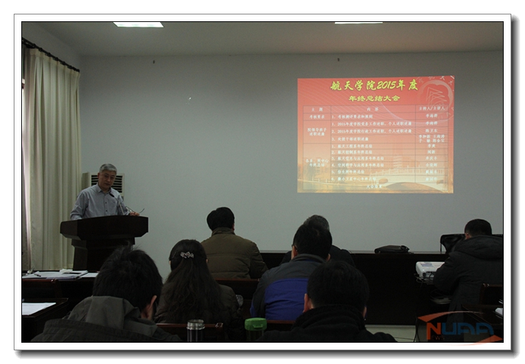 1月7日下午2:30,航天学院在明故宫校区3号楼318会议室召开学院2015年度年终总结大会。会议由学院党委书记季海群主持,航天学院全体教职工参会。 ![]() 会议开始前,季海群就本年度新推行的网络民主测评的相关要求和操作规范向全体教职工做了详细的说明。 ![]() 会议伊始,季海群作年度学院党务工作总结。2015年,航天学院党委大力加强学院思想政治建设,形成学院昂扬向上的发展氛围;着力加强班子领导能力建设,巩固学院的组织核心作用;扎实推进各项重点工作,圆满完成本年度工作计划;全面落实党风廉政建设责任制,反腐倡廉工作深入开展。 接着,陈卫东作年度行政工作总结,他指出:学院本年度不断推进人才培养机制改革,稳定提高人才培养质量;潜心提升学科科研实力,多方开拓学术交流渠道;“引、培、聘”并举,打造高水平师资队伍;广泛开展国际合作与交流,不断提升办学国际化水平;坚守“三个确保”底线,为学院发展保驾护航。 ![]() 此后,大会进入处级干部述职述廉环节。学院领导班子成员分别就个人年度工作向全体教职工做述职述廉报告。 会议最后,航天工程系、航天控制系、航天信息与应用系、空间科学与应用系、仿生结构与材料防护研究所、微小卫星研究中心等六个系所中心负责人分别代表自己所在部门做本年度工作总结。 至此,学院2015年度年终总结大会圆满落下帷幕。 |