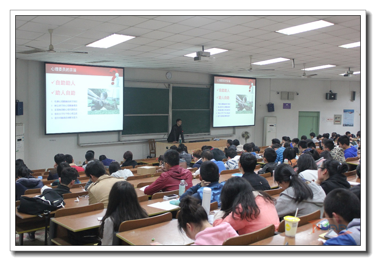 活动于19点正式开始,会上我校心理健康教育中心老师杨易致辞,他介绍了我校今年3.20心理健康教育周的活动安排以及2016年度心理气象员培训的一系列相关工作,呼吁广大心理气象员用自己的专业性为身边的同学服务。随后来自南京师范大学的曹加平老师做了以“心理委员的自我修炼”为主题的演讲。他以心理气象员的宗旨是“自助助人”展开,结合自身和工作实例,由心理气象员的职责、职能以及重要性深入,为心理气象员们上了一堂生动的专业知识课。在一个半小时的演讲中,心理气象员们认真听,认真记。教室内掌声不断,笑声不断。