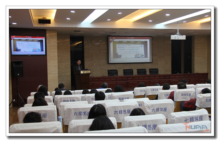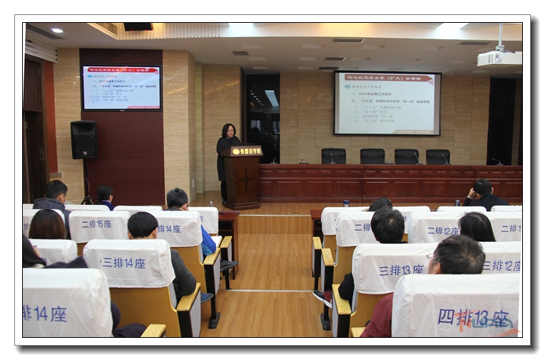 3月18日下午,外国语学院召开新学期第一次全院教职工大会。学院党政领导和全体教职工参加了大会,会议由院党委书记刘健荣主持。 会上,院党委书记刘健荣传达了学校第十五届党委第十六次全委(扩大)会议精神。她从2015年主要工作情况、“十三五”发展形势分析及“双一流”建设思路、2016年学校重点工作等三个方面解读了聂宏校长工作报告;围绕“我们南航面临什么样的新局面?”、“面对新形势、新任务,我们应该怎么办?”两个问题传达了郑永安书记重要讲话精神。