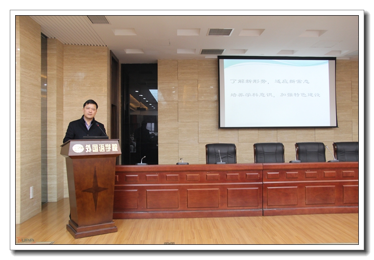 院长范祥涛传达了学校“十三五”规划及“双一流”建设工作动员大会精神,结合领导重要讲话和报告阐述了“双一流”建设的内涵意义、发展路径和建设任务,使老师们对我校“十三五”规划和“双一流”建设工作所面临的挑战和机遇有了更加清晰、深刻的认识。范院长还结合大会分组讨论情况以及学院实际,围绕如何推进“双一流”建设提出了外语学科的发展思路和目标举措。他指出,“双一流”建设对外国语学院来说是机遇大于挑战,老师们应抓住此次重大机遇,了解新形势,适应新常态,培养学科意识,加强特色建设,通过努力干事在改革和建设过程中增强“获得感”。随后,范院长围绕制度建设、科研管理、竞赛组织、教学改革等几方面对学院新学期重点工作进行了部署。  副院长刘长江、徐以中分别围绕各自分管工作,就如何推进“双一流”建设提出了具体的想法和建议,同时对本科专业与公共课程建设、学科评估、竞赛、科研、研究生教学等重要工作以及常规工作进行了安排部署。对学院前期已按学校要求开展的科研经费自查自纠和整改工作进行了着重强调,要求全体教职工转变观念、认清形势、强化意识,自觉做好相关工作。