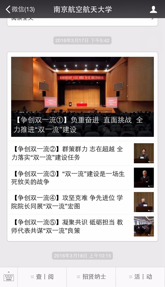就晓航自己来说,能在南航读大学,是非常非常自豪的,回顾我们母校的历史,南航自1952年建校,用26年成为全国重点大学,用33年成为研究型大学,跻身211,并且还在前进着,这是教育界的传奇。可是随着时代的前进,高校间的竞争日益激烈,南航的发展也确实走到了极为关键的当口,建设双一流,再次完成跨越,迫在眉睫!
