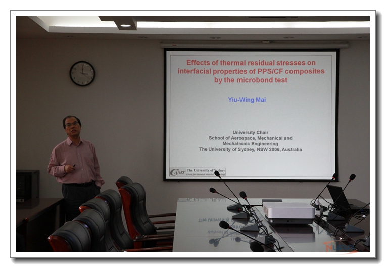 应我校机械结构力学及控制国家重点实验室高存法教授邀请,澳大利亚联邦杰出学者、澳大利亚科学院和工程院两院院士、英国皇家学会两院院士、我校名誉教授Yiu-Wing Mai(米耀荣)教授于2016年4月4日至8日访问了我校,并于4月5日为我校师生做题为“Re-examination of thermal residual stress effects on interfacial properties of thermoplastic matrix micro-bond test”的学术报告。报告内容丰富、生动、精彩,综述了热残余应力对复合材料界面性质的影响,对我校相关科研工作具有借鉴作用。同时,米耀荣院士还结合自己多年的研究经历,讲述了在科学研究中需注意的若干问题。航空宇航学院副院长沈星教授主持了此次报告。