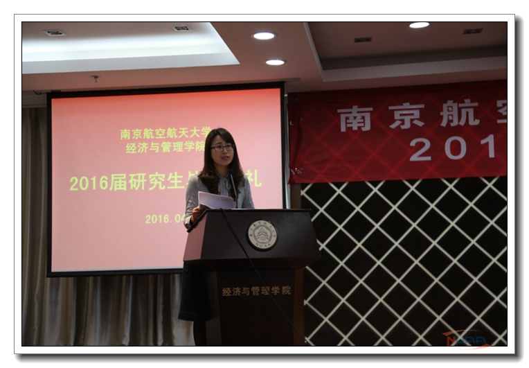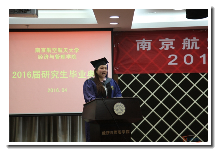 4月1日下午,经济与管理学院在将军路校区学院报告厅举行2016届研究生毕业典礼。学院领导、专业老师代表、2016届研究生和家长代表出席了典礼。 毕业典礼由学院党委副书记许静老师主持,党委书记焦宏图、院长周德群、副院长张卓分别向获得优秀硕士论文、校优秀毕业研究生、2015年国家奖学金获得者颁发了奖状。周德群院长与张卓副院长为毕业生们共同授予学位。随后,周德群院长向毕业生传达了他的殷切期望,在寄语中,周院长首先对经管学院2016届硕士研究生顺利毕业和获得硕士学位表示了由衷的祝贺。随后,他叮嘱毕业生们 “头脑中绷紧学习的弦”,养成终身学习的习惯,注意自我提升;“手中握着理性的宝剑”,具备判断、分析、推理等能力;“眼中绽放着智慧的光芒”,勤于思考,明辨是非;“鼻子保持敏锐的嗅觉”,洞察发展趋势,与时俱进;“耳朵能听见多方声音,尤其是逆耳忠言”;“心中常怀祖国和人民”,以国家和人民的利益为先,不要太过计较个人得失;“血管里流淌着道德的血液”,守住底线,不为外界所浸染。周院长热情洋溢、语重心长的讲话博得同学们阵阵热烈的掌声。
