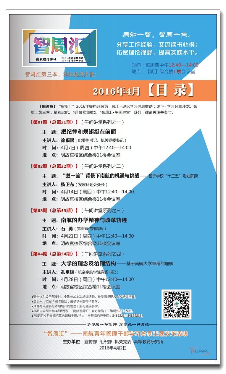 ![]() 为了进一步提高我校科级干部履职能力,提升管理服务工作质量,4月7日中午,“智周汇·午间讲堂”在明故宫校区综合楼11楼会议室准时开讲。党委组织部部长、党校副校长李遥做培训动员。校纪委副书记、机关党委书记徐福民与科级干部们做了题为“把纪律和规矩挺在前面”的首场交流。 ![]() “智周汇·午间讲堂”是由组织部、党校、宣传部联合举办,利用每个周四午休时间,面向科级干部组织的系列培训交流活动。第一期主题为“南航与我”,通过邀请一些学校主要职能部门的主要负责同志,与科级干部们近距离交流学校近期改革发展的核心理念、重点工作,并向他们传递最直接、最真实的期望与要求,引导科级干部站在学校发展的大视野里,思考本职工作、谋划自身发展,从而为“十三五”开局起步及“双一流”创建工作更好地集智聚才。 ![]() 首场报告之后,“午间讲堂”还将陆续邀请发展计划处处长杨卫东、党委宣传部部长石勇、航空宇航学院党委书记(原发展研究中心主任)孔垂谦等围绕学校“十三五规划”、南航办学精神与改革轨迹、南航大学章程等做专题交流。